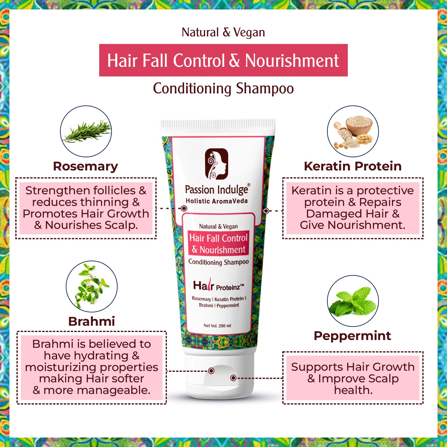 شامپو رزماری از رزماری، پروتئین کراتین، نعناع فلفلی و براهمی تهیه شده است.