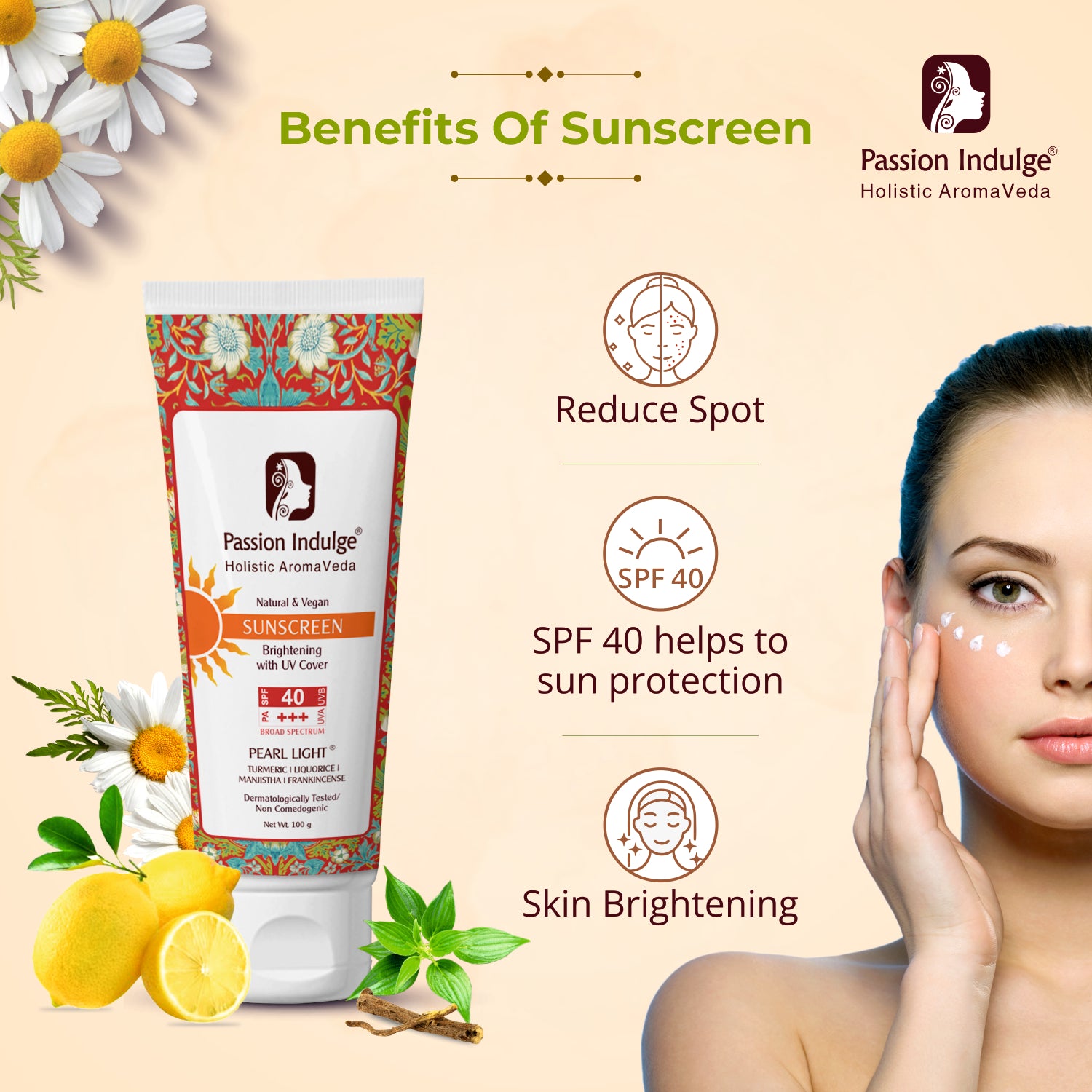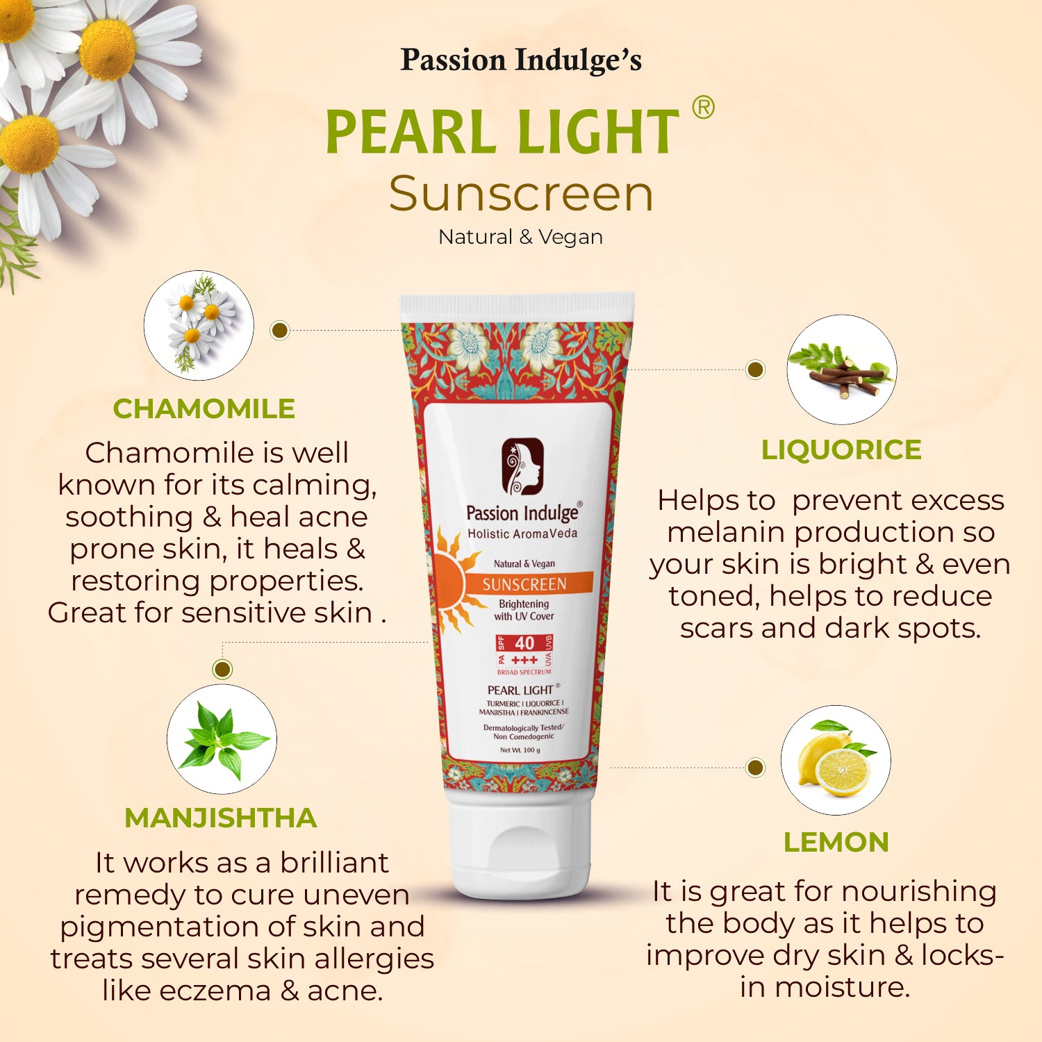 Pearl Light Natural Sunscreen 100 gm- PACK OF 2 | Sun Burn Protection | Sun lightning formula with UV Protection |SPF 40 | Dermatologically Tested | Natural & Vegan